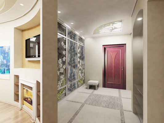 Главное место в квартире – гостиная. Ведь это настоящий домашний очаг, где по вечерам собирается вся семья, готовится вкусный ужин и происходит обсуждение дня прошедшего и планов на будущее. «Домашность» помещения подчеркнута электрическим камином и аквариумом, которые вносят определенную нотку спокойствия и ощущение большого загородного дома. Это же чувство возникает сразу при входе, благодаря витражам в прихожей.
