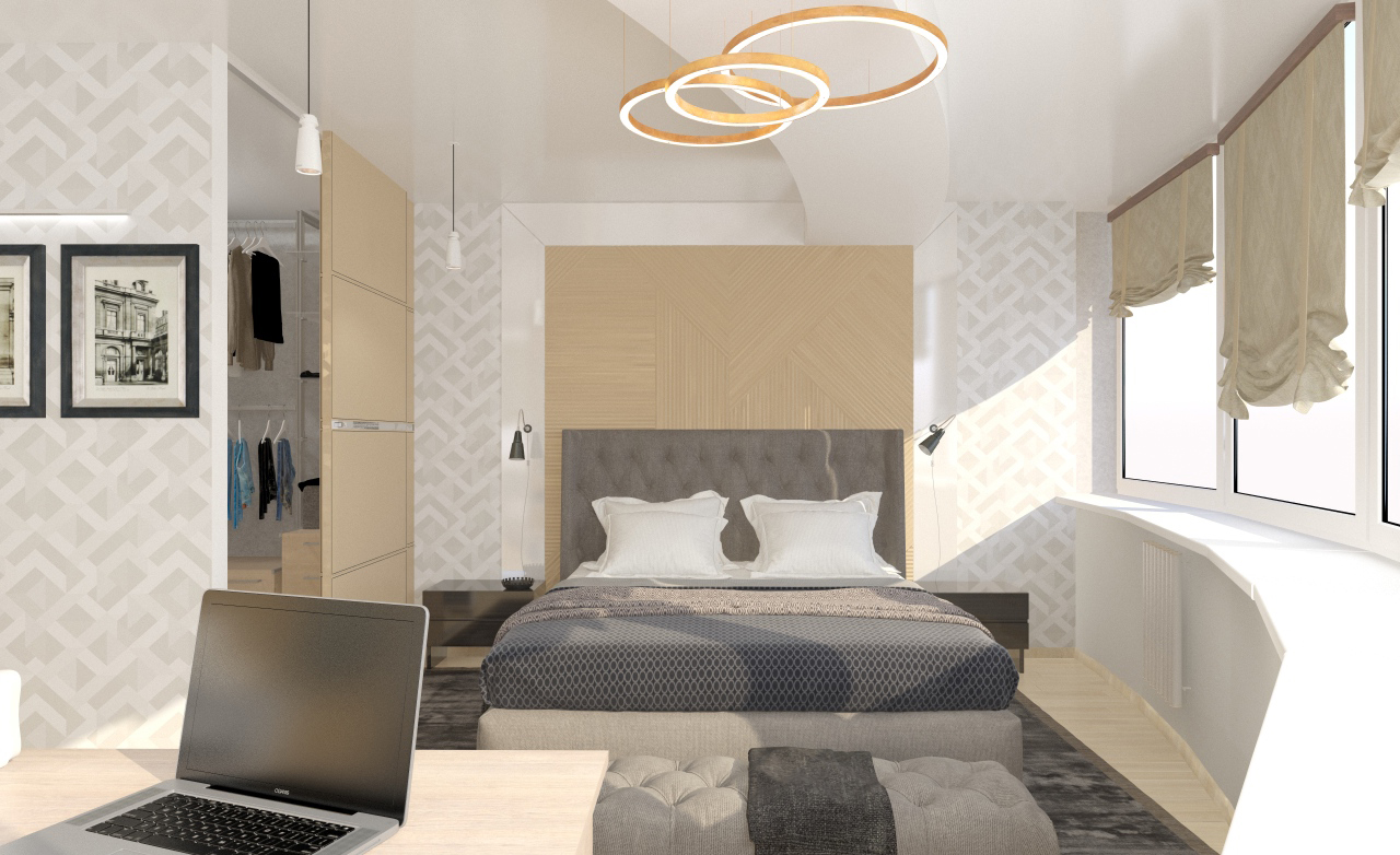 Чтобы сделать спальню больше, мы решили присоединить ее к комнате-лоджии. За счет этого мы смогли выделить зону для просторного гардероба.