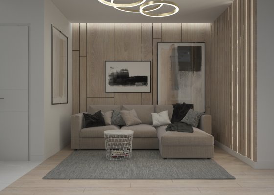 Дизайн-проект интерьера квартиры создавался для молодой семьи. Поскольку квартира вытянутой формы и всего с двумя окнами, мы расположили комнаты так, чтобы спальня и кухня были с естественным освещением, а зал находился в центре. В интерьере мы использовали светлые тона и лаконичные формы. Контрастом выступили деревянные рейки с подсветкой. В целом интерьер получился минималистичным, но при этом уютным.