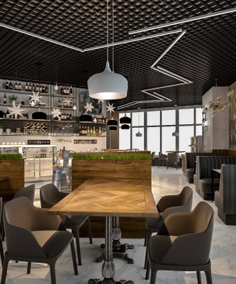 Дизайн-проект кофейни был разработан для бизнес центра в районе ул. Первая Морская. При проектировании мы учли несколько факторов: т. к. кофейня находится в холле и полностью отткрыта, мы отталкивались от общего цветового решения холла и учитывали его дизайн. Также бизнес центр задавал целевую аудиторию кафе. В дизайне кофейни мы использовали темные тона и акцентную подсветку. Также мы учли различные варианты посадочных мест для разных компаний.