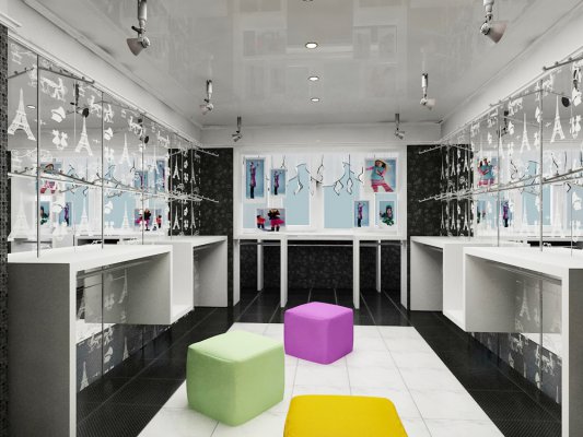 Помещение магазина разделено на четые отдельных зала, которые соединены между собой расширенными порталами. Визуально магазин разделен на 2 части, так как товар представлен в двух коллекциях. Первая коллекция очень яркая: в каждой вещи сочетаются до десяти цветов. Для этой коллекции мы предложили два зала в светлых золотисто-бежевых тонах. Вторая же коллекция наоборот в светлых сдержанных тонах. Она будет представлена в черно-белых залах. А коридор и кассовая зона объединяет все помещения.